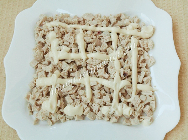 Куриное филе измельчить и выложить на блюдо первым слоем. Сделать майонезную сеточку.