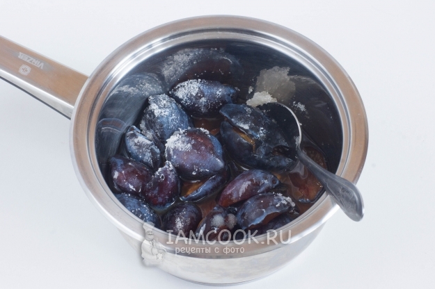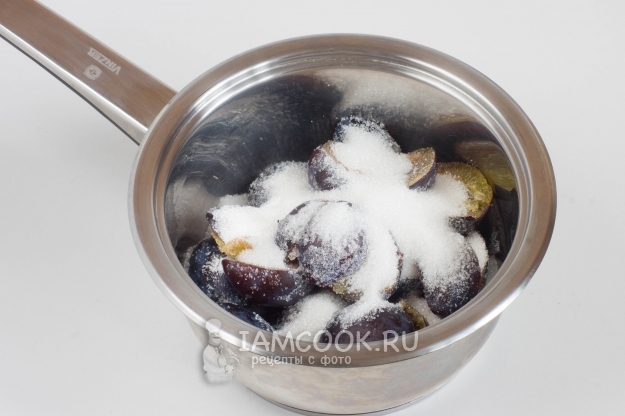 Засыпьте ломтики слив сахарным песком и оставьте на ночь.