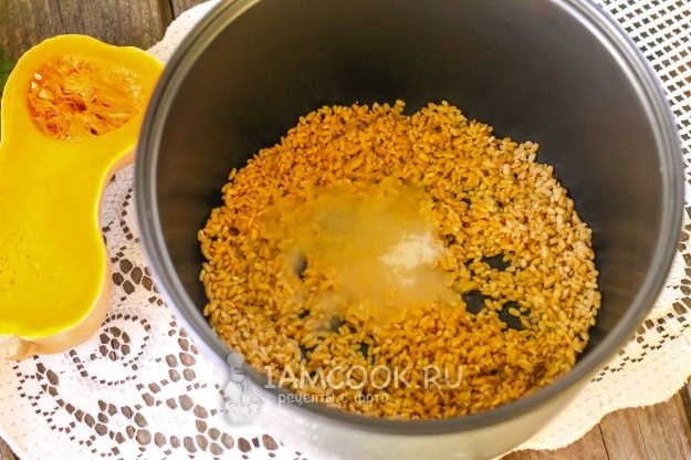 Пересыпьте затем промытую крупу в чашу мультиварки и добавьте туда же соль и сахарный песок.