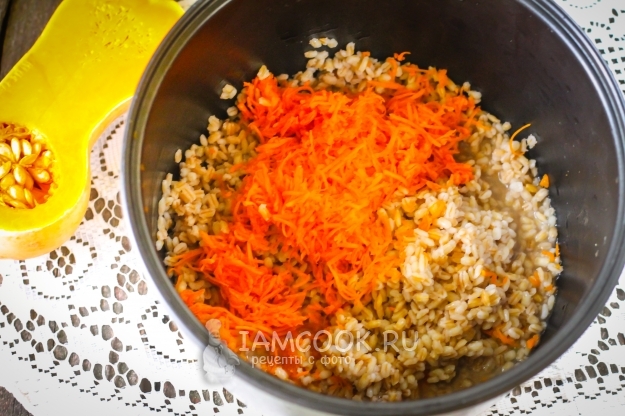 Очистите кусочек тыквы и натрите его на терке с мелкими ячейками. Добавьте в чашу за 5 минут до готовности, перемешайте. Дождитесь звукового сигнала, еще раз перемешайте и закройте крышку техники, оставляя блюдо на режиме подогрева в течение 10 минут. За это время перловка втянет в себя тыквенный аромат и вкус, лишнюю жидкость, станет сочной, ароматной.