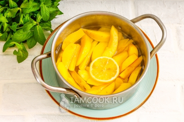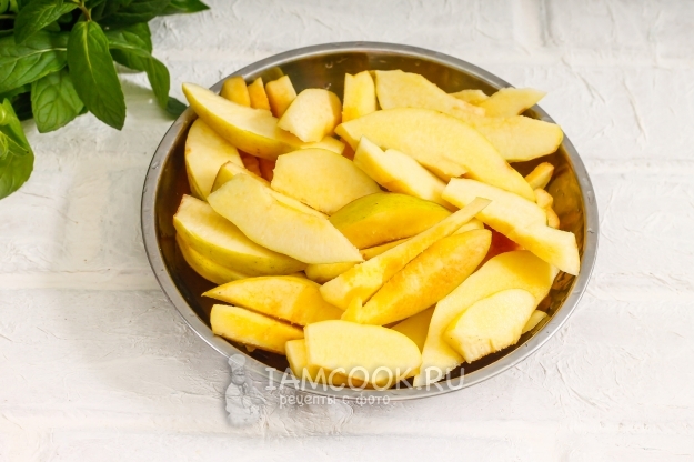 Извлеките, остудите и разрежьте каждый плод на четыре части. Удалите семенные блоки, нарежьте кусочками.