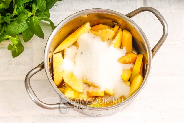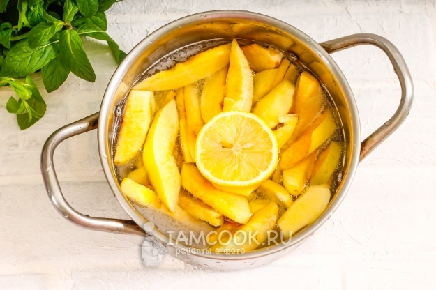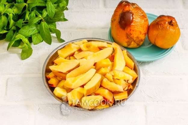 Оставшиеся фрукты разрежьте на четыре части и вырежьте семенные блоки. Действуйте очень быстро, так как мякоть айвы окисляется при взаимодействии с воздухом, становится ржавой. Промойте мякоть и нарежьте ломтиками.