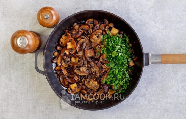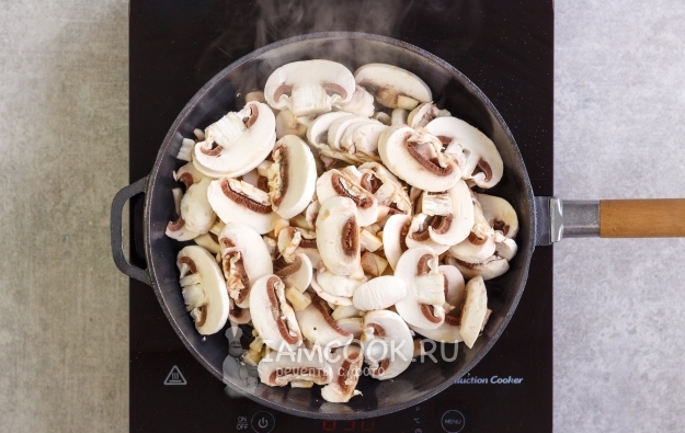Сверху аккуратно выложите обжаренные грибы.