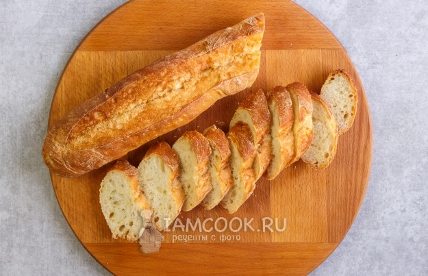 Багет (или чиабатту) нарежьте на кусочки шириной 1 см.