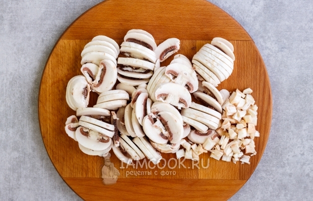 Шампиньоны очистите от кожицы и нарежьте пластинками толщиной примерно 0.5 см.