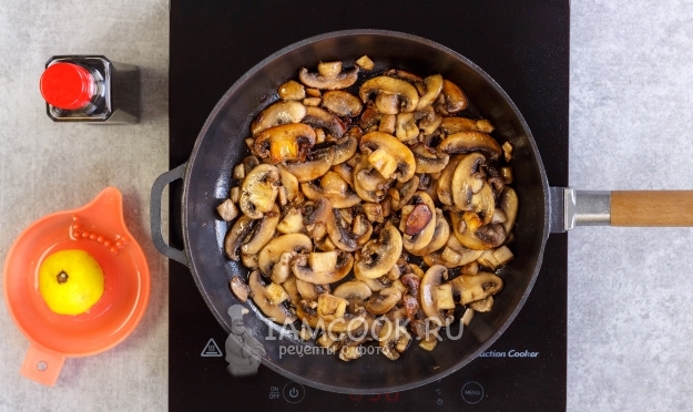 Влейте 2 ст.л. соевого соуса и 0.5-1 ст.л. лимонного сока (по вкусу) и обжарьте грибы еще 2 минуты.