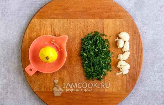 Чеснок очистите и плоской стороной ножа слегка раздавите на дощечке. Петрушку мелко нарежьте, выжмите сок из четверти лимона.