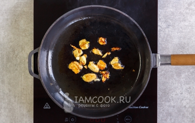 На сковороду налейте оливковое масло и обжарьте зубчики чеснока на среднем огне до золотистого цвета (примерно 2-3 минуты). Извлеките чеснок из масла и на время отложите.
