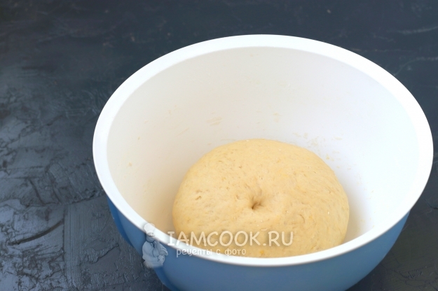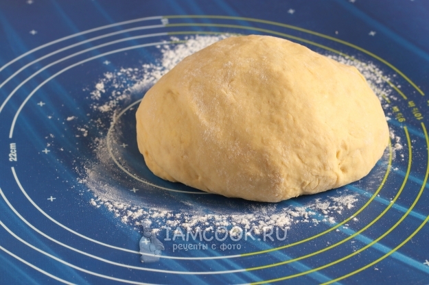 Рабочую поверхность присыпать мукой и выложить готовое тесто. Ещё раз тесто обмять.