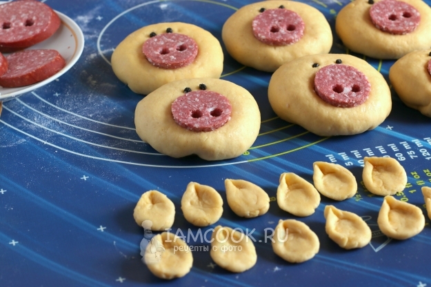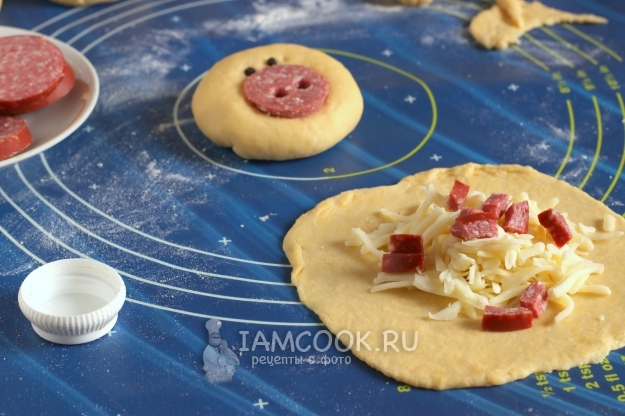 От каждого шарика отщипнуть небольшой кусочек, из которого будем делать ушки. Каждый шарик раскатать в лепёшку, в центр положить горсть сыра и кусочки колбасы. Я использовала ободок, который остался после вырезанных пятачков.