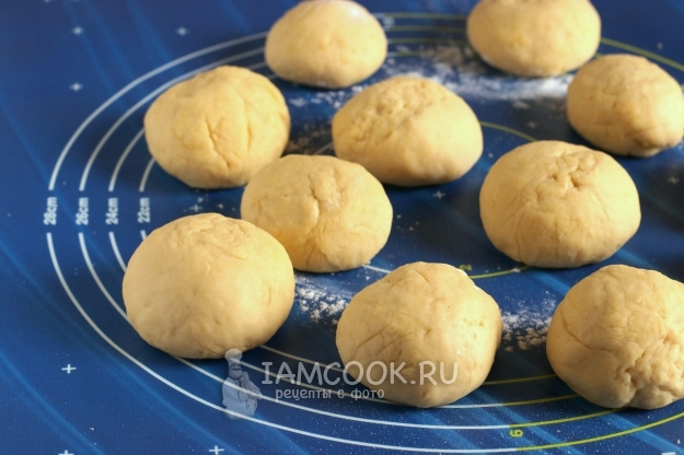Разделить тесто на 12 кусочков и каждый затем скатать в шарик. Прикрыть тесто плёнкой, чтоб не заветривалось.