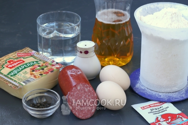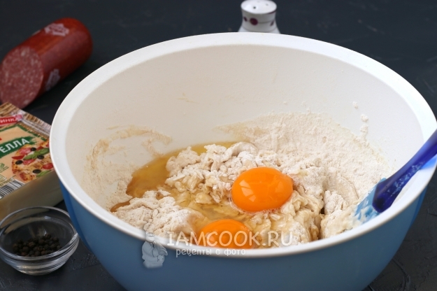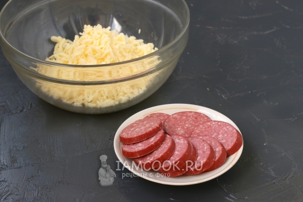Перед тем, как продолжить работу с тестом, подготовить сыр и колбасу. Сыр я взяла моцареллу, но твёрдый тоже можно использовать. Сыр натереть на тёрке, а колбасу нарезать шайбочками по 0.5 см. Колбаса также подойдёт варёная или копчёная.