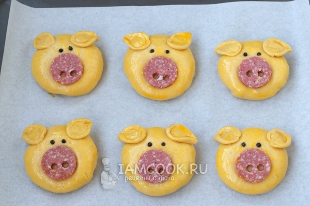 Духовку разогреть до 180 градусов и выпекать булочки «Хрюши» с колбасой 30-40 минут. Остудить булочки на решётке и можно подавать.