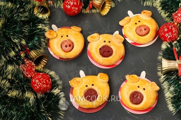 Хочу предложить вам приготовить булочки "Хрюши" с колбасой. Такие булочки можно подать на праздничный стол в качестве закуски и испечь за день до торжества, чтобы в предновогодний вечер не тратить много времени на приготовление. Для наполнения булочек можно использовать сосиски или кусочки колбасы, а также немного сыра.