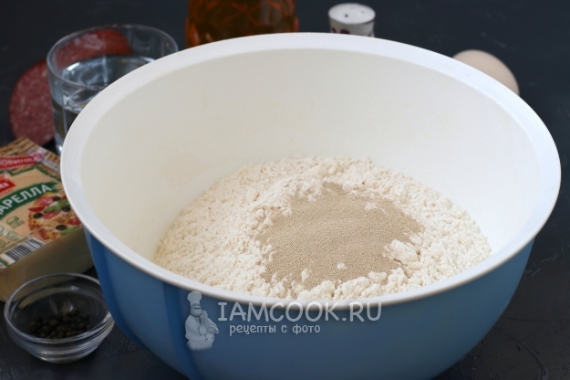 В глубокую миску просеять муку, добавить соль и дрожжи, перемешать.