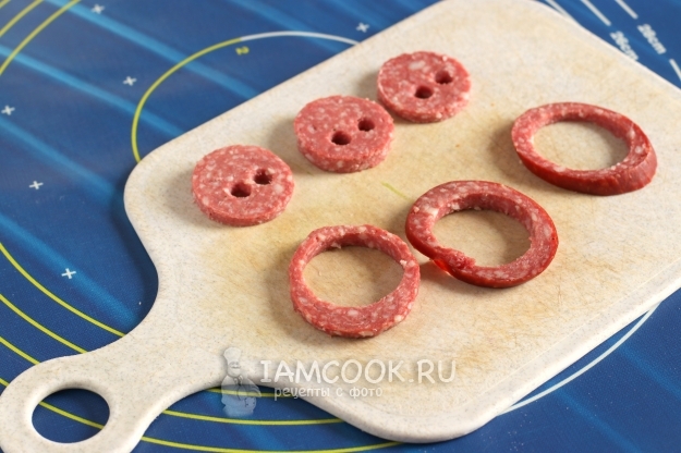 С помощью подходящей формочки вырезать из колбасы пятачки будущих свинок. Сделать ноздри.