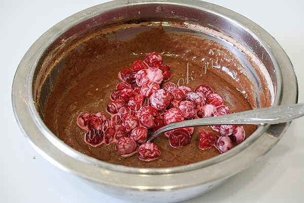 Добавьте вишню в основное тесто и аккуратно перемешайте.