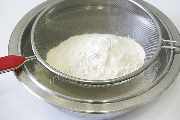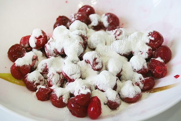 Если вы используете замороженную вишню, то сначала необходимо её разморозить, откинуть на дуршлаг и дать стечь соку. Затем вишню надо обвалять в крахмале или муке.