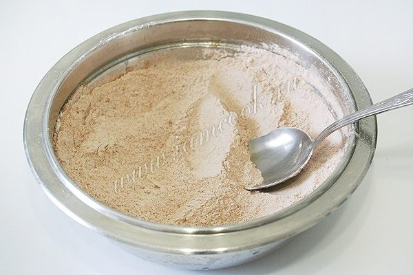 Смешайте сухие составляющие – это мука, сахар, разрыхлитель и какао-порошок. Разрыхлитель вы можете заменить содой и погасить уксусом. Вам понадобится примерно 1 ч.л. соды. Но при использовании соды её нужно будет добавить в жидкие компоненты.