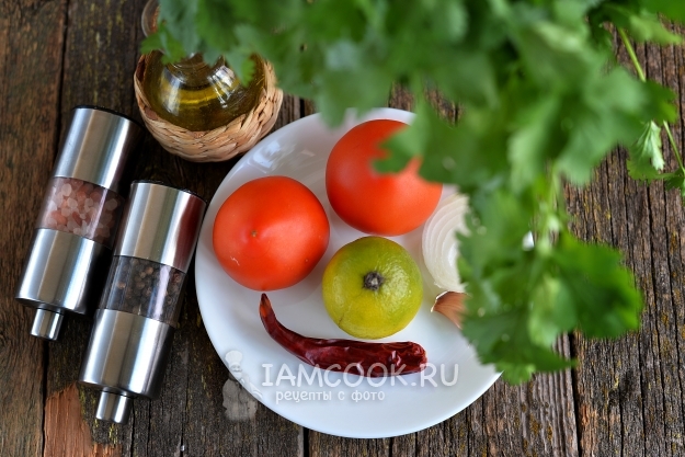 Подготовим необходимые продукты по списку. Лук и чеснок очистите от шелухи, помойте вместе с кинзой и помидорами под проточной водой, обсушите. Помидоры берите мясистые и ароматные. Идеально для этого рецепта подойдут сорта "микадо" или "примадонна". В отличие от зеленого соуса сальса верде, для красного все измельчается вручную.