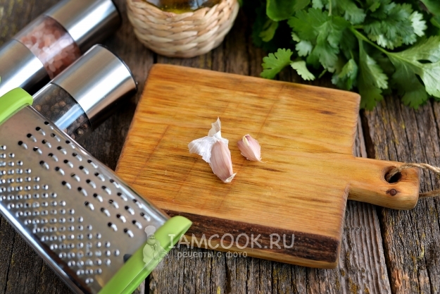 Чеснок пропустите через пресс или натрите на самой мелкой терке.