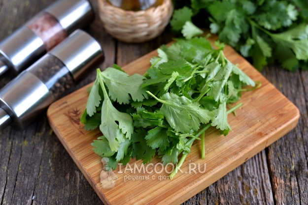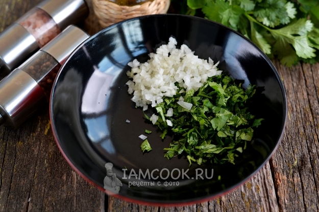 Кинзу и белый салатный лук нарубите острым ножом настолько мелко, насколько сможете это сделать.