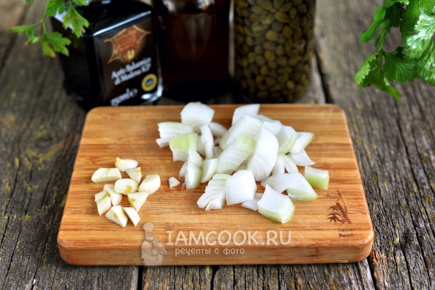 Нарежьте салатный лук небольшими кусочками, большой зубчик чеснока слегка нарубите ножом.