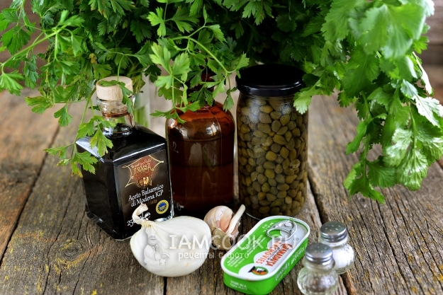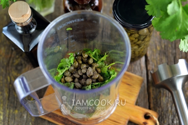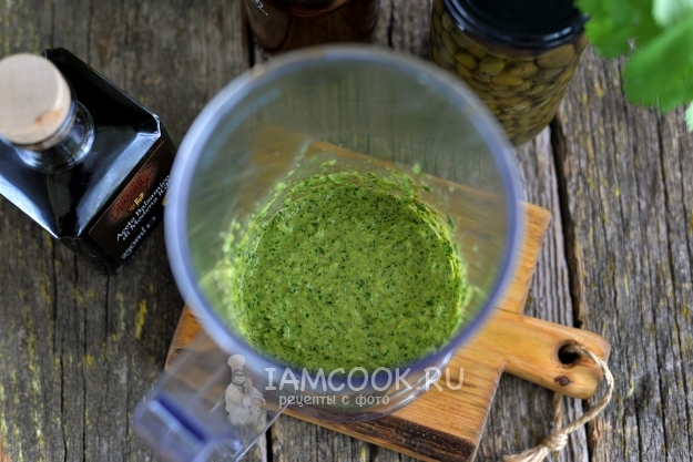 Традиционно сальса верде, как и песто, измельчают вручную, но сейчас это гораздо проще и быстрее приготовить с помощью блендера. Так что сложите лук, чеснок, петрушку, кинзу, анчоусы, каперсы, черный молотый перец в чашу блендера, добавьте красный винный уксус и оливковое масло. Можно для аромата влить немного масла от анчоусов.