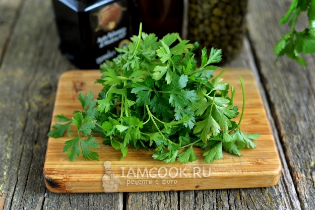 Небольшой пучок петрушки помойте под проточной водой, хорошенько обсушите бумажными полотенцами. Отделите листья от стеблей, у петрушки они часто волокнистые и с ними готовый соус получится не таким нежным. Нарубите петрушку острым ножом.