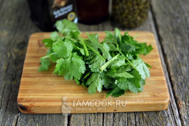Также помойте и обсушите кинзу. В отличие от петрушки, у кинзы стебли сочные и хрустящие, так что рубим кинзу в соус вместе со стеблями.