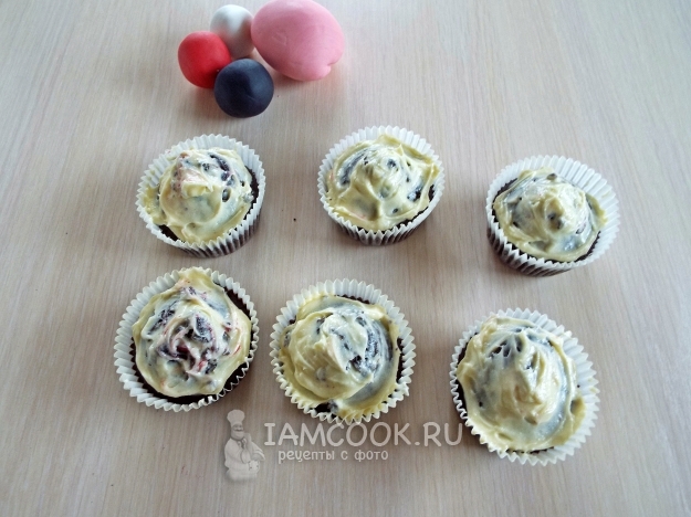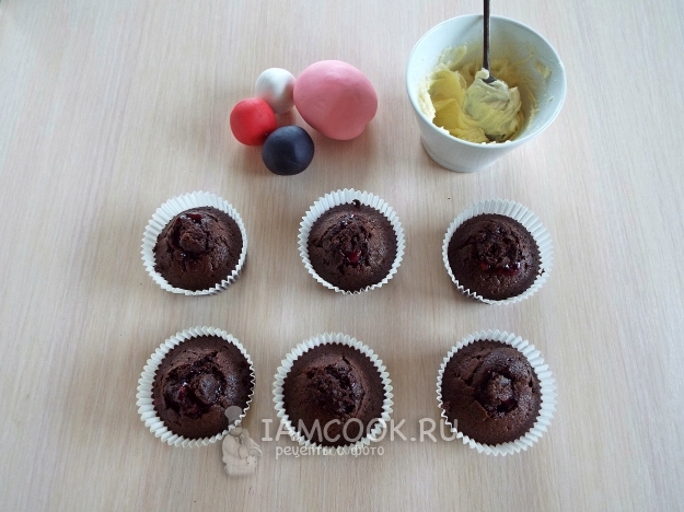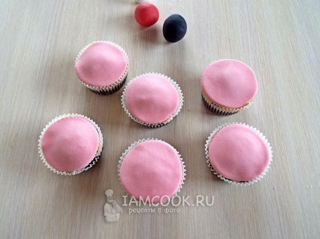 Сами маффины получаются не сильно сладкими, но сладость компенсируется мастикой. Мастику надо окрасить в три цвета: розовый (большая часть), красный и черный (маленький кусочек).