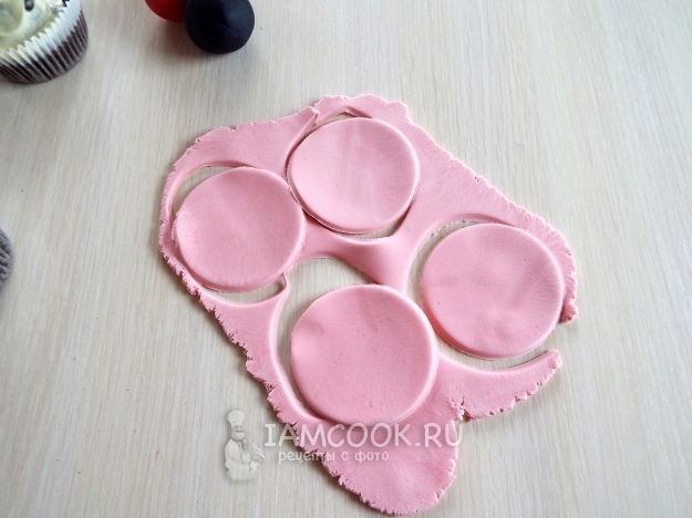 Розовую мастику раскатать. Вырезать кружочки диаметром как сам маффин.