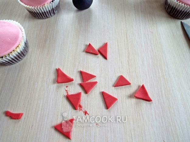 Красную мастику раскатать, нарезать на полоски, а затем и на треугольники.