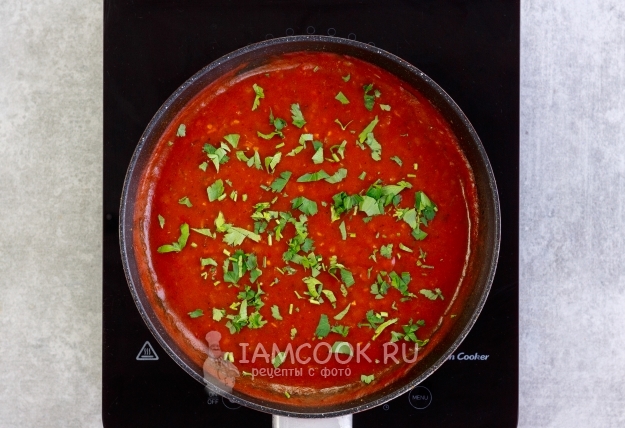 Выключив огонь, подкорректируйте вкус подливы добавив по необходимости еще немного соли, перца или сахара. По желанию, присыпьте подливу щепоткой нарезанной петрушки.