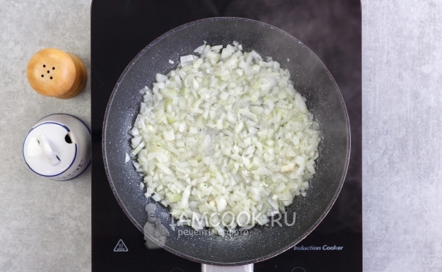 Разогрейте на среднем огне растительное масло. Добавьте нарезанный мелкими кубиками репчатый лук, щепотку соли и сахара. Периодически помешивая, обжарьте лук до мягкости и золотистого цвета (примерно 7 минут).