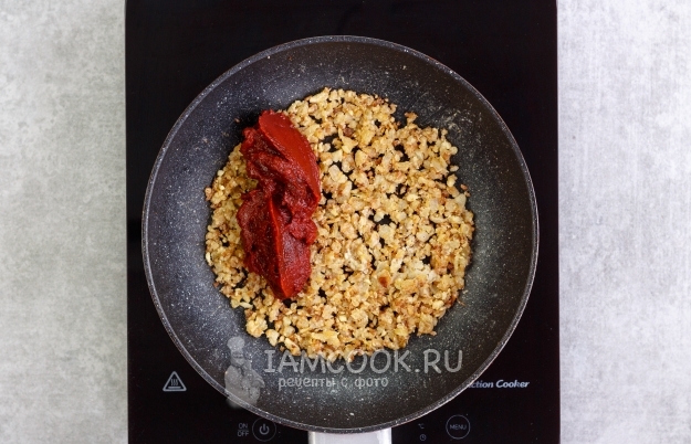 Затем добавьте в сковороду томатную пасту и, продолжая постоянно помешивать, обжарьте все еще 1-2 минуты, пока паста не сменит свой цвет. На этом этапе можно немного уменьшить огонь.