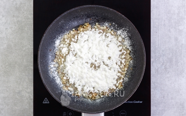 Просейте в сковороду пшеничную муку (или рассыпьте тонким слоем). Помешивая, обжарьте смесь еще 2-3 минуты. Мука должна приобрести золотистый оттенок, и должен проявиться ее «ореховый» аромат. Смешавшись с маслом и овощами, мука свернется в небольшие комочки – это нормально, продолжайте обжаривать эти «комочки» до золотистого цвета.