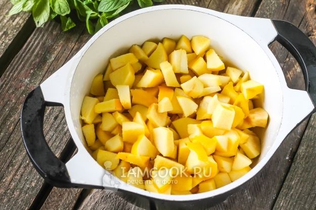 Затем измельчите очищенные кусочки айвы прямо в казан. Чем мельче будет нарезка, тем быстрее сварится повидло.