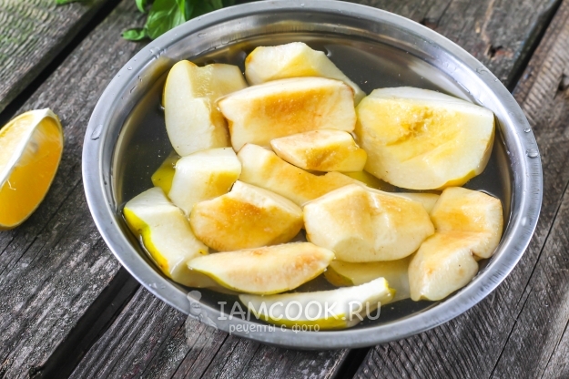 Плоды айвы промойте в воде, удаляя с их поверхности ворс. Разрежьте с усердием на четыре части и удалите все семенные блоки и подпорченные места. Нарезку выложите в емкость с водой, не забыв влить туда лимонный сок. Его можно заменить несколькими щепотками лимонной кислоты.