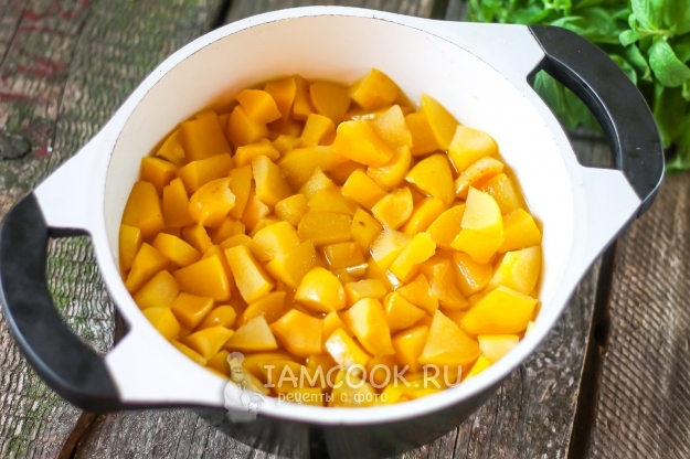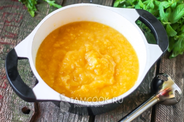 Измельчите при помощи погружного блендера, стараясь не обрызгаться, так как масса будет горячей. Снова поместите на плиту, накрыв казан крышкой, и протомите на умеренном огне примерно 5 минут. В это время простерилизуйте банки и крышки.