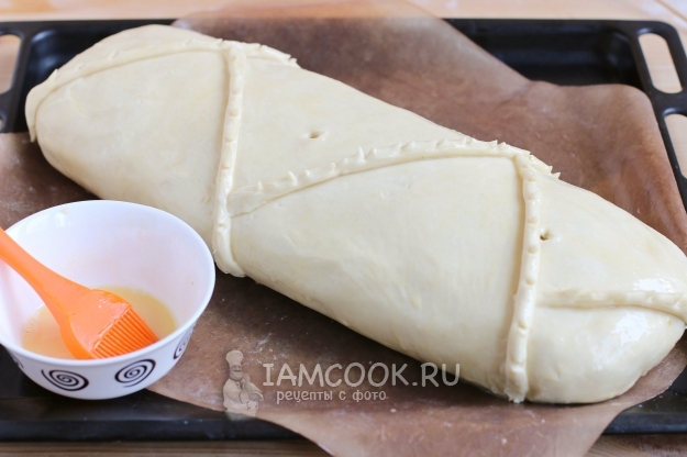 А затем аккуратно перевернем кулебяку на пергамент или другой антипригарный коврик, на котором разместим ее на противне. Моя кулебяка получилась достаточно большой и поместилась на противне только по диагонали. Из остатков теста можно сделать различные украшения на кулебяке. Смажем кулебяку взбитым яйцом.