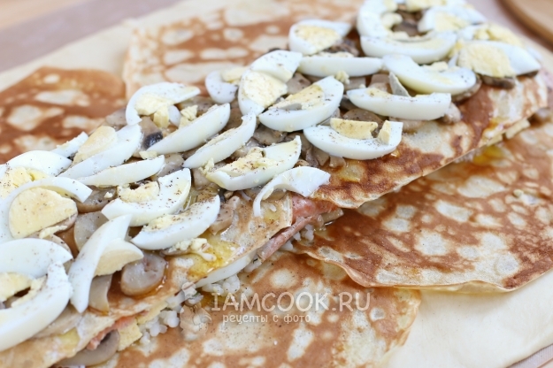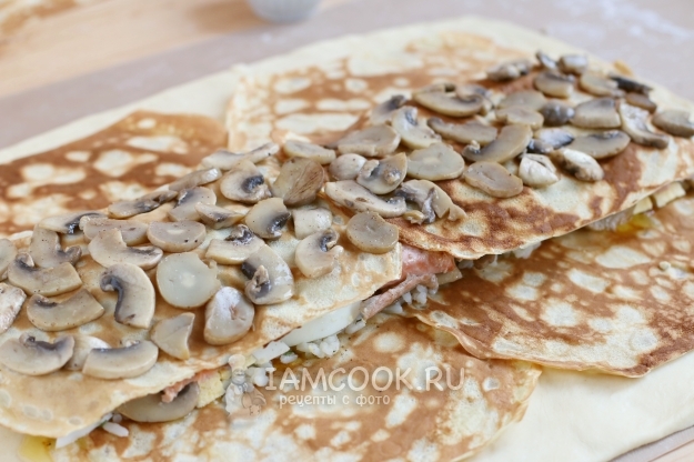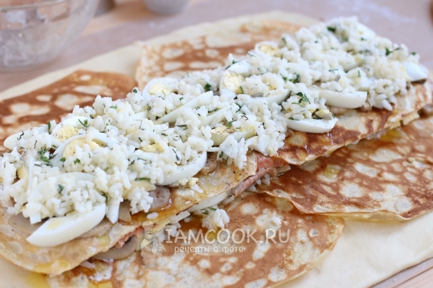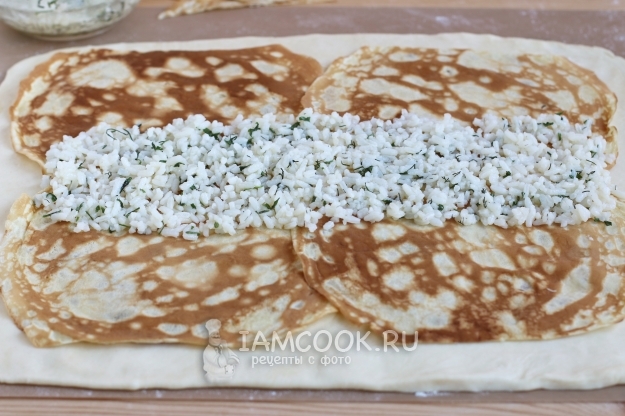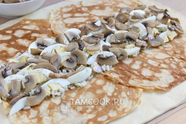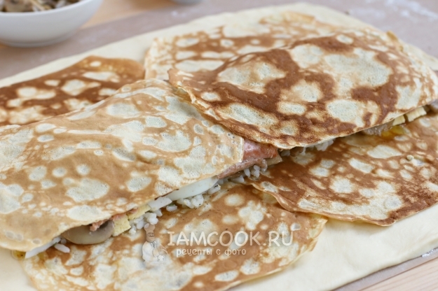 Оборачиваем начинку нижними блинчиками.