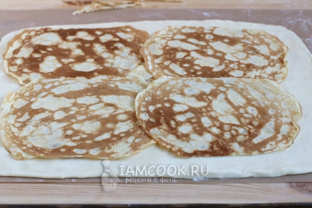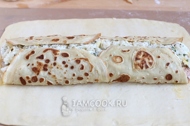 Покрываем поверхность теста блинчиками, лишние края отрежем.