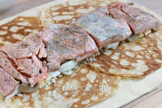 Накроем рыбу двумя блинчиками, с которых срежем лишние края.