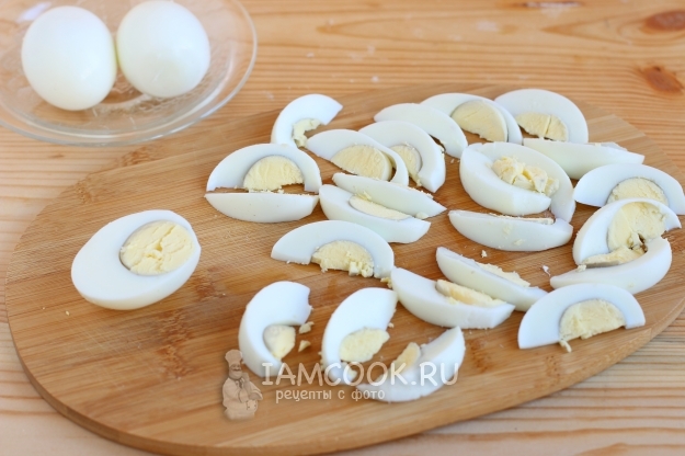 Отваренные и остывшие куриные яйца очистим и нарежем на дольки.