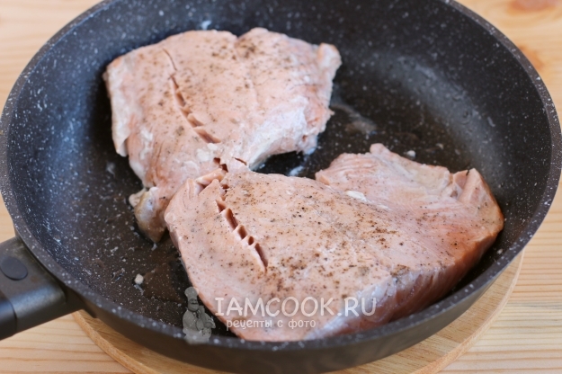 Красную рыбу обжарим на очень слабом огне с небольшим количеством растительного масла, можно добавить 2-3 столовые ложки воды, накрыть крышкой и протушить ее буквально 5 минут. Рыбу можно даже недоготовить, чтобы во время выпекания она не стала сухой.