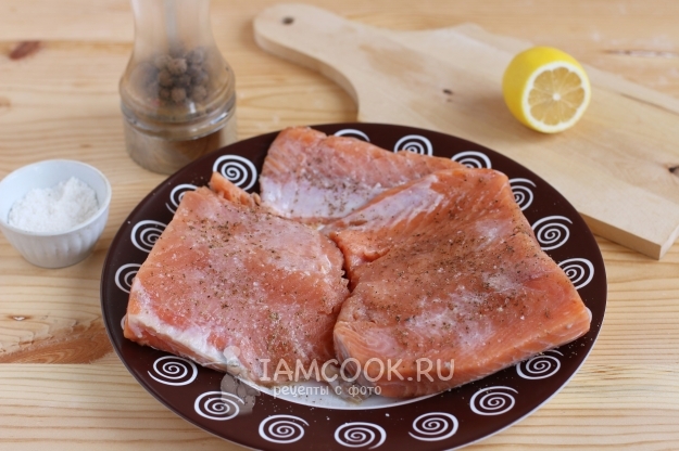 Подготовим для кулебяки рыбу. Филе лосося солим и посыпаем смесью молотых перцев с двух сторон. Также сбрызгиваем рыбу лимонным соком.