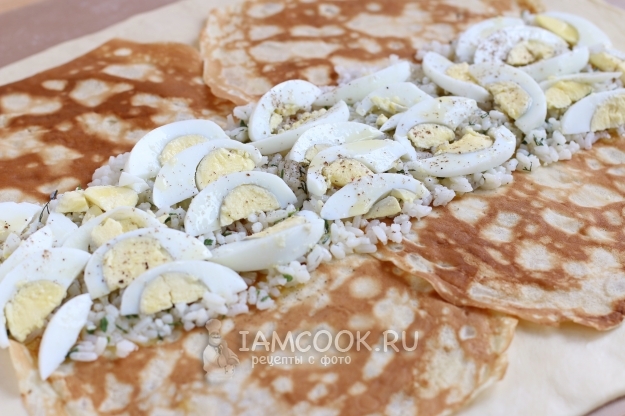 На рисовую начинку выложим половину нарезанных яиц, приправим яйца солью, молотым перцем и сбрызнем растопленным маслом.