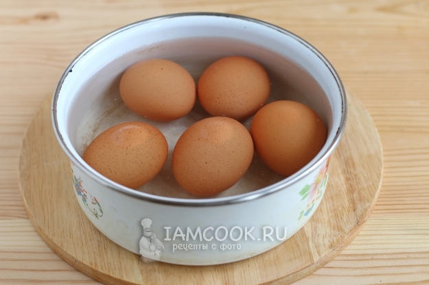 Для следующей начинки нам нужно отварить куриные яйца вкрутую. Кладем их в емкость, заливаем водой и ставим на плиту отвариваться в течение 8 минут.