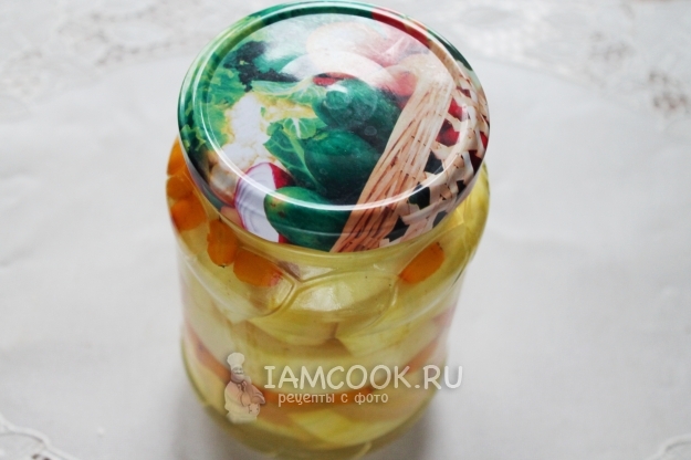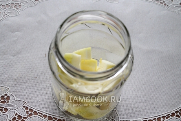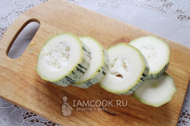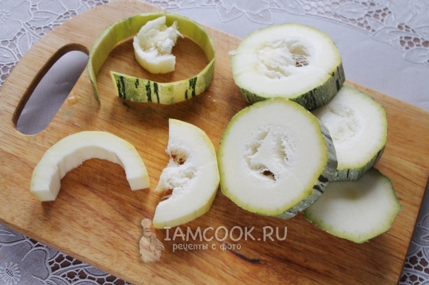 Кабачок нарезают шайбами, похожими на ананасовые, потом рассекают их пополам полукольцами или нарезают кусочками, двигаясь по кругу, имитируя ананас.